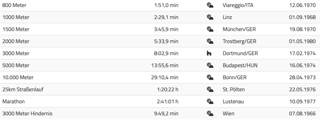 Folgende persönliche Bestleistungen findet man auf der ÖLV-Homepage: