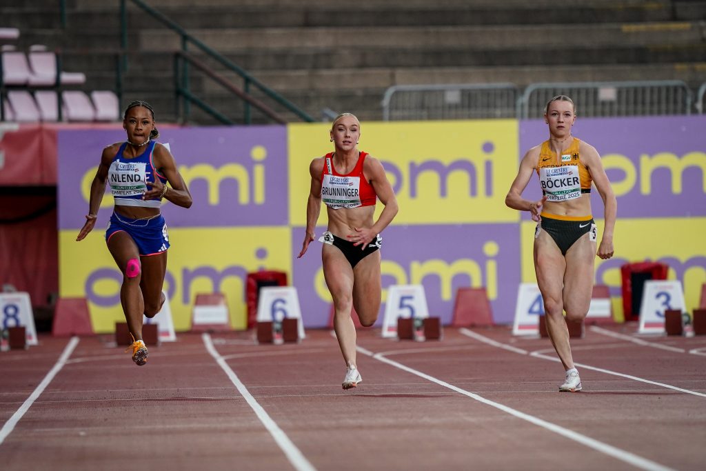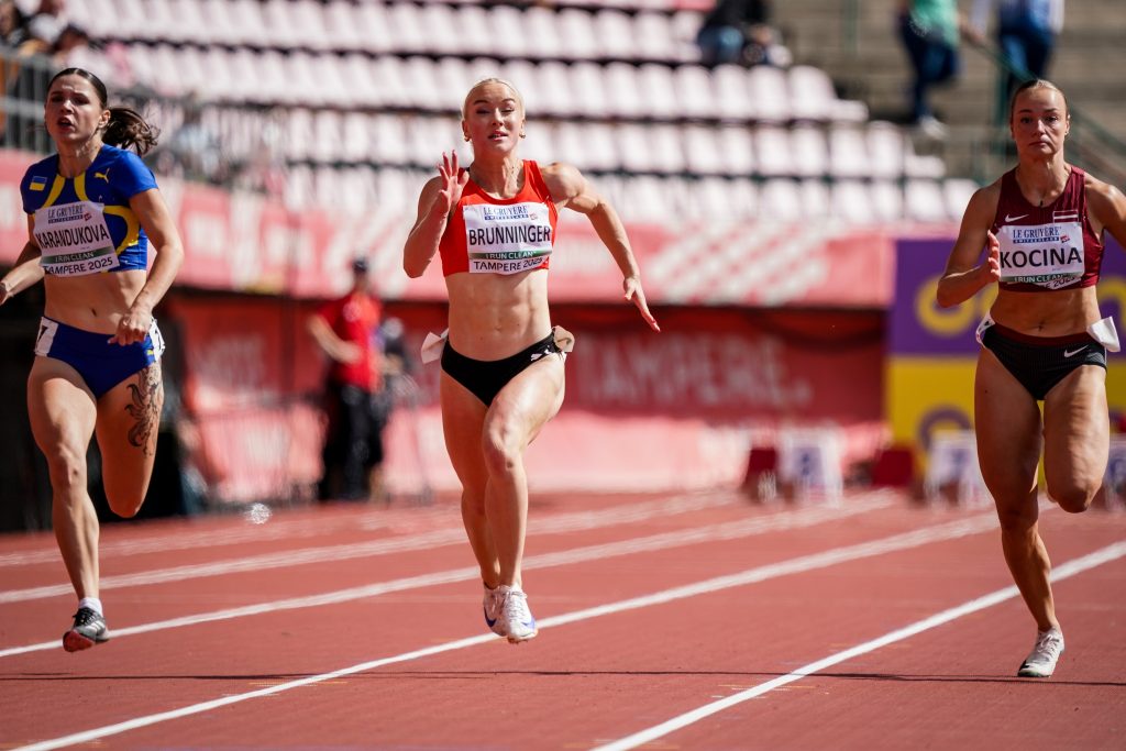 Patricia BRUNNINGER (ATSV Linz LA, Jg. 2006) war Donnerstag kurz vor Mittag als Zweite aus OÖ im Einsatz. Lange Zeit führte sie in ihrem Vorlauf, doch der starke Gegenwind (2,1 m/sek) in einigen (nicht allen!) der sechs Vorläufe (mit insgesamt 44 Teilnehmerinnen !) warf sie mit 12,02 sek auf Rang 24 des Vorlauf-Summary zurück. Am Abend gab es dann schon die Vorschlussrunde (drei “Semi-Finals“). Im ersten Lauf kam Patricia mit um drei Hundertstel besserer Reaktionszeit als im Vorlauf (0,15 zu 0,18) auf 11,88 sek und Platz sechs. Bei Gegenwind von diesmal nur 0,2 m/s. Insgesamt ergab das Platz 20 für die heuer zuvor auf sehr vielversprechende 11,49 verbesserte Linzerin. Die Finalqualifikation wäre mit 11,72 sek gar nicht allzu weit entfernt gewesen. Aber die EM-Dichte war heuer (ähnlich wie im Zehnkampf, wo 200 Punkte mehr gleich 7 Plätze gebracht hätten) noch stärker als in den Jahren zuvor. Ein Semifinal-Lauf konnte sogar Rückenwind von 0,7 m/sek genießen – und brachte dann immerhin drei Läuferinnen ins Achter-Finale.