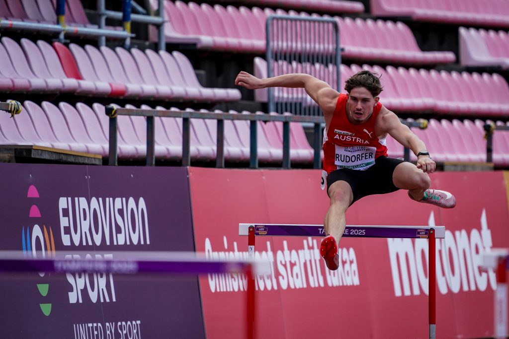 Julius RUDORFER aus Sankt Oswald (TGW Zehnkampf-Union, Jg.2007), hatte sich mit erfreulichen 52,60 sek in Sankt Pölten beim Liese-Prokop-Memorial Ende Juni für diese EM qualifiziert, obwohl er dem jüngeren U20-Jahrgang angehört. Mit 53,07 sek gelang ihm am Donnerstag-Mittag der Aufstieg ins Semifinale, obwohl er auf der Gegengeraden kurz mit einer einmaligen 17-Schritt-Sequenz den Ideal-Rhythmus verloren hatte. Im Vorlauf war ihm die Außenbahn zugelost worden, im Semifinale dann die Innenbahn – beides nicht wirklich ideal vom Kurvenradius bzw. von der möglichen Gegner-Orientierung her. Im Semifinale am Freitag (es gab drei davon, eigentlich ein „Tertial“-Finale, „Semi“ heißt ja halb, aber das wird von EA und WA seit Jahren ignoriert) kam Julius mit läuferischer Qualität erneut auf eine gute Zeit – diesmal 53,12 sek, allerdings erneut nicht ganz im gewünschten durchgehenden 15er-Rhythmus. Insgesamt ergab das den 21. Schlussrang. Für das nächste Jahr, wo er ja weiter in der U20 starten kann, sind zwei tiefe 53er-Zeiten innerhalb von 24 Stunden ein vielversprechendes Fundament!