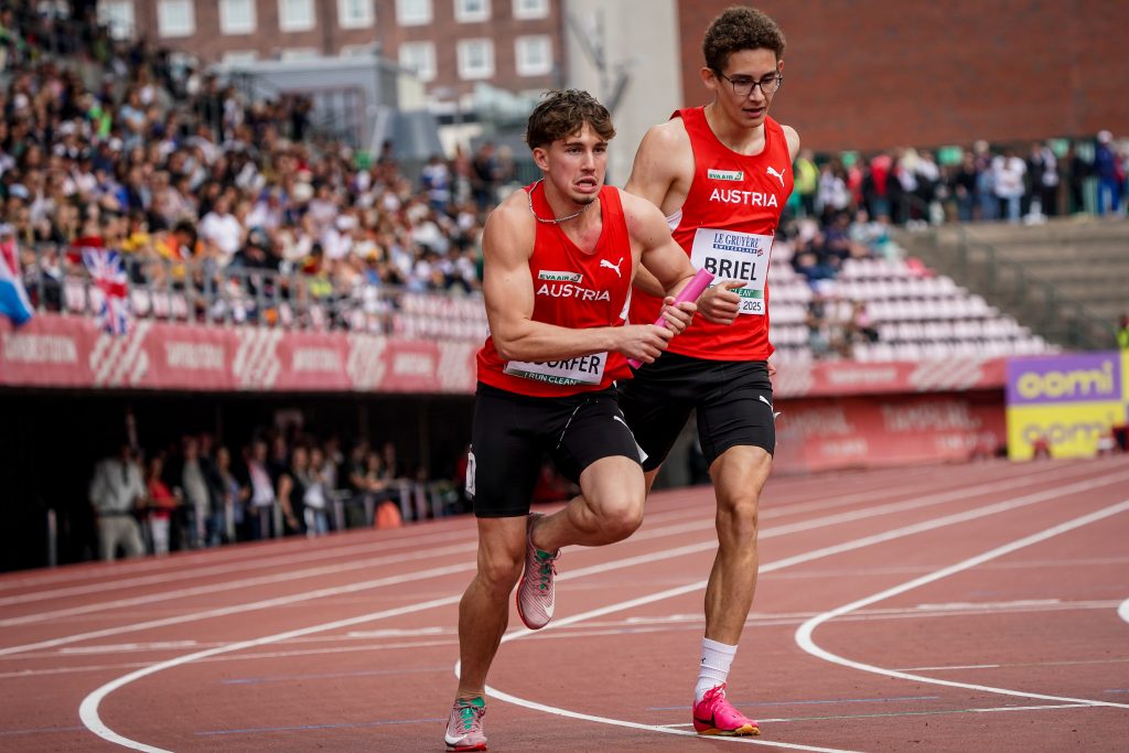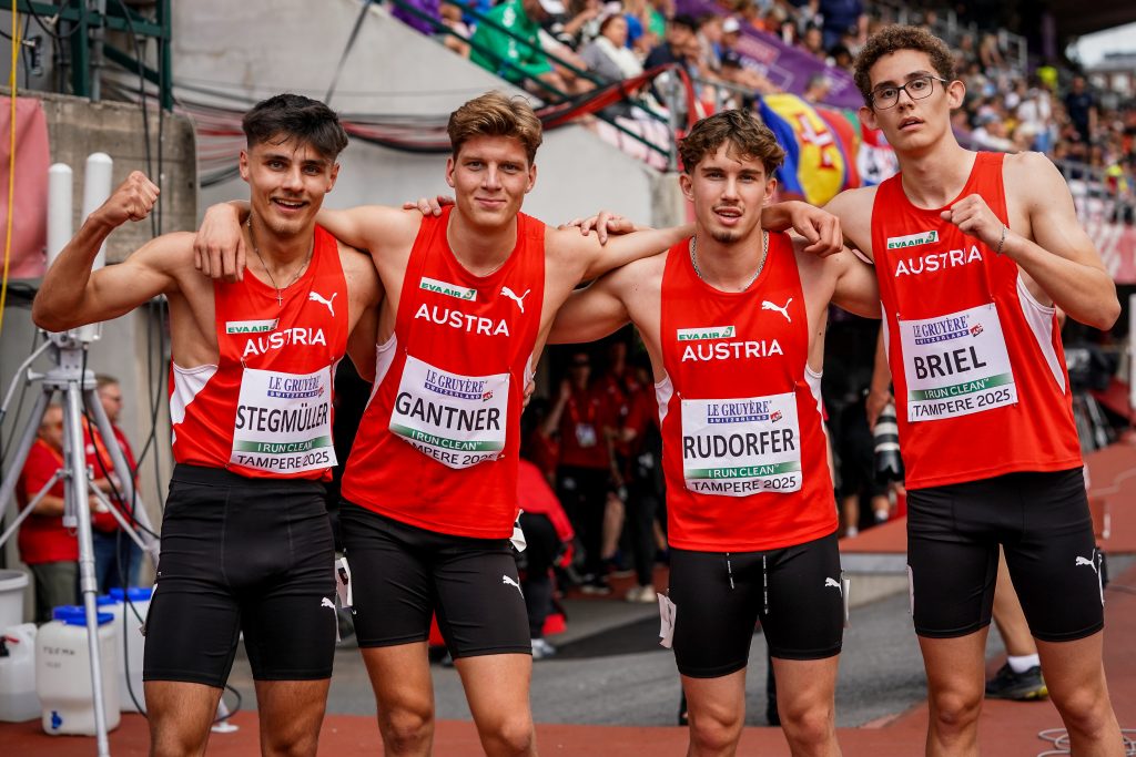 Am dritten Tag dieser viertägigen EM kam Julius Rudorfer dann schon zum dritten Mal zum Einsatz. Und zwar im Vorlauf über 4 x 400 m. Auch Alexander Heinz wäre neben drei Läufern, die extra vom ÖLV nach Helsinki geflogen worden waren, am Tag nach dem Zehnkampf noch eine Option gewesen (auch eine 48,80-Bestzeit seit der U23-ÖM in Graz), aber Teamleiter Christian Taylor wählte letztlich folgende Aufstellung: Raphael BRIEL (ULC Linz Oberbank, geboren im September 2007, also einer der jüngsten Starter bei dieser EM)-Julius RUDORFER-Michael GANTNER-Lukas STEGMÜLLER. Julius absolvierte also seinen dritten EM-Einsatz innerhalb von drei Tagen. Wie eigene Messungen, aber auch der offizielle Ergebnisbericht zeigen, liefen alle vier annähernd gleich schnell. Raphael hatte ja den Start und die Beschleunigung zu absolvieren und die drei anderen konnten fliegend losstarten (50,1-48,8-48,8-48,98 zeigt der offizielle Ergebnisbericht – möglich geworden aufgrund der neuen Chips integriert in die vordere Wettkampf-Startnummer).